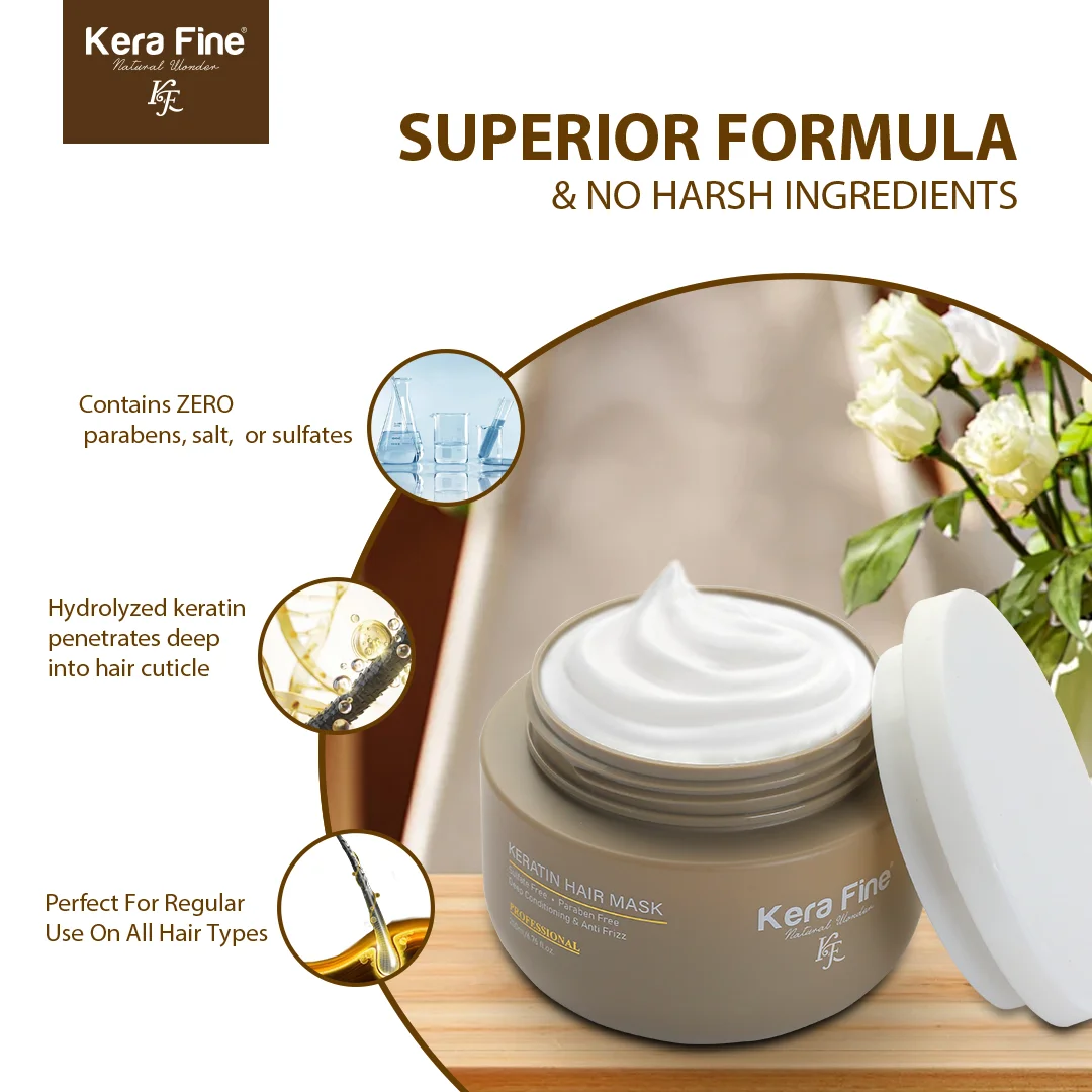 Pro Tip: This keratin hair mask should be applied weekly. Use with Kera Fine Keratin Shampoo and Conditioner to have a full homecare hair care experience.
